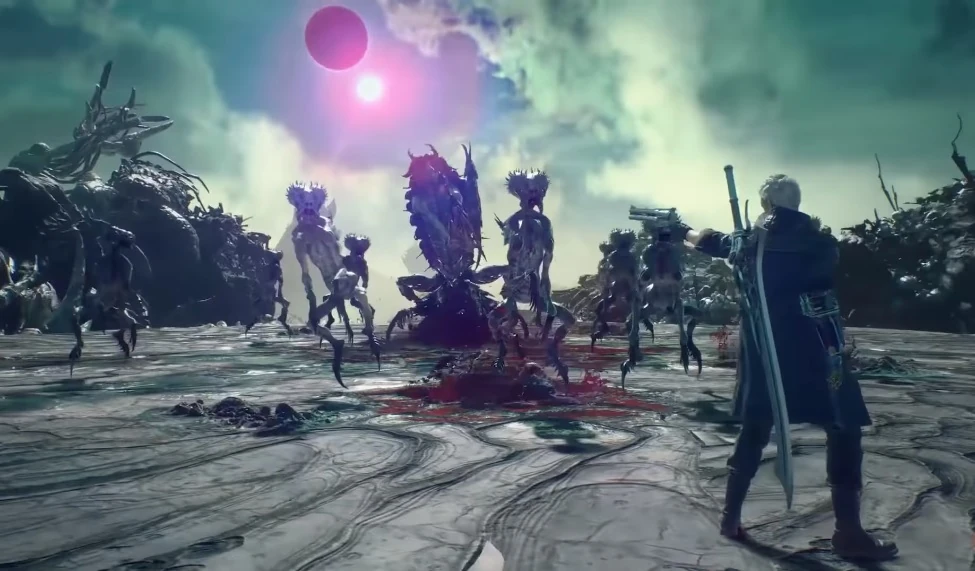 The myriadpod grabs Nero by the leg and slams him into the ground, but the only damage it seems to do is leave a Nero-shaped indentation on the ground. By the time the fight's over, both of Nero's wings have burst from his back, the claws at the joint and his face, chest and hands covered in sticky, dripping centipede (millipede?) blood.