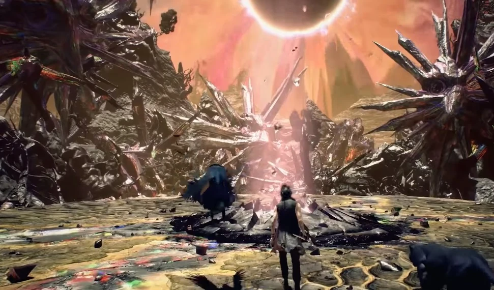 He steps forward over the red ooze. Same as that pulsating ground and spiralling tree root. Nero's world just looks a certain way, he's learned. He doesn't craft anything of his own, not yet—but he does watch Nero build the blackened rocks, the jagged platforms. That's when he crouches down. Studies a vague point in the distance for a moment.
